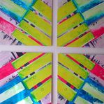 2000vrije interpretatie van stukje strandstoel en windscherm . 4 paneeltjes van 60 x 60 cm, op talloze manieren te combineren. De compositie per paneel is zodanig dat zij altijd op mekaar 'aansluiten, hoe je ze ook draait. Met dezelfde kleuren is elk paneel toch op een andere manier geschilderd, maar dat kan ik niet op de foto laten zien